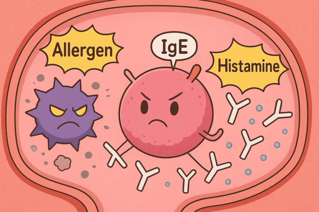 當你吸入外界的小小顆粒—像是灰塵、花粉、塵蟎或動物皮屑——你的免疫系統會把它們誤認為「敵人」。這些「敵人」我們稱為過敏原(allergen)。如果你是過敏體質,體內的免疫系統就會啟動,製造特定的抗體(IgE)。這些 IgE 貼在名叫「肥大細胞」的免疫細胞上,一旦過敏原靠近,就會觸發肥大細胞釋放大量「化學物質」,最主要的是「Histamine」(組織胺)。